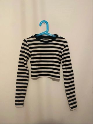 Crop top de manga larga con un diseño moderno y llamativo. - Estampado gráfico en blanco y negro. - Cuello redondo. - Mangas largas con detalles de puntos.