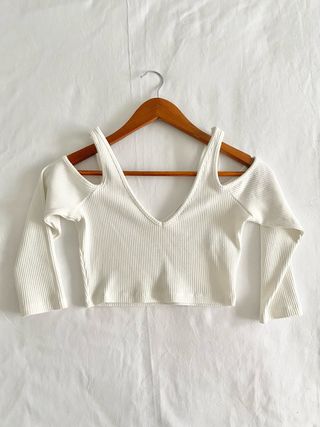 Top blanco de manga larga con un diseño moderno y atrevido. Perfecto para un look casual o de noche. - Manga larga. - Escote con abertura central. - Corte crop.