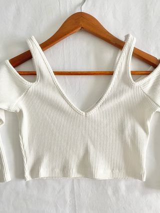 Top blanco de manga larga con un diseño de escote en la espalda. - Manga larga. - Corte crop top. - Escote pronunciado en la espalda.