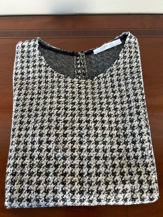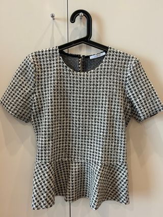 Jersey de manga corta / Top jaspeado pata de gallo gris/blanco. Volante a la altura de la cadera baja hace una forma muy bonita. Tejido ligeramente elastico se adapta muy bien. Nuevo. TS Zara
