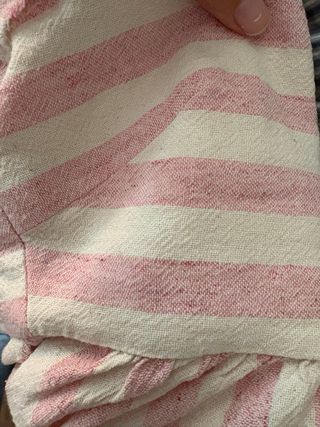 Top con estampado de rayas verticales en rojo y blanco. Presenta un escote pronunciado y mangas abullonadas. - Diseño con lazada frontal. - Mangas cortas abullonadas. - Escote Bardot. - Está un poco dado.