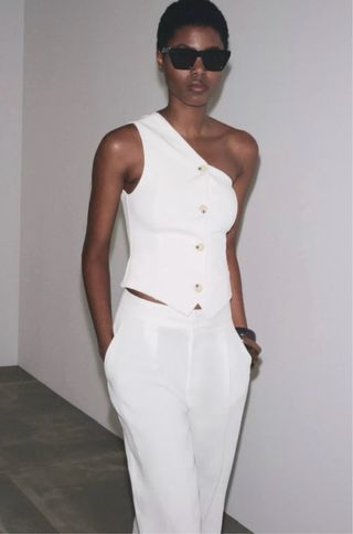 Top armilla asimétrico interlock de zara en color blanco. - Diseño de un solo hombro. - Cierre de botones. Completamente nuevo y sin estrenar, en perfecto estado. Talla S. Viene con un botón de repuesto.