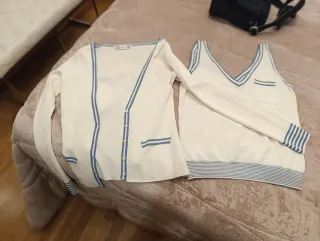 Conjunto de rebeca y top de Zara en blanco con detalles en azul claro. El top tiene un escote en pico y la rebeca se abrocha con botones. - Diseño con ribetes en contraste. - Bolsillos delanteros. - Puños y bajo de la rebeca con rayas.