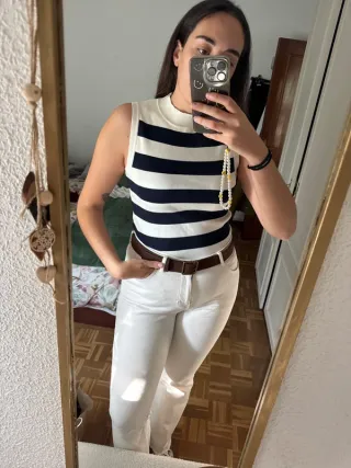 Precioso top de tirantes de la marca SHEIN. Es de color blanco con rayas negras. Tiene un diseño sencillo y elegante. - Es de algodón. - Talla única. - Perfecto para el verano.