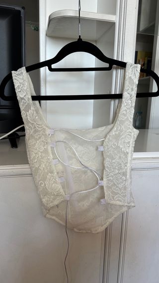 Precioso top blanco estilo corset, ideal para ocasiones especiales. Es de encaje y tiene un diseño delicado. - Talla S - Espalda abierta con cierre de cordones - Encaje blanco roto