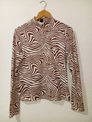 Top de manga larga con cuello alto y un llamativo estampado. - Diseño de rayas marrones y blancas. - Cuello alto. - Manga larga.