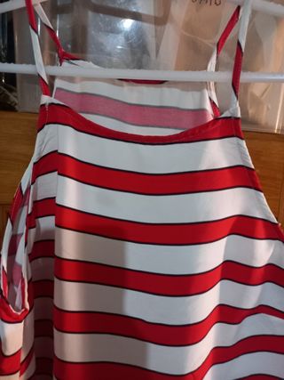 Preciosa camiseta sin mangas con estampado de rayas rojas y blancas. Es una prenda bonita y cómoda, ideal para el verano. - Diseño de tirantes finos. - Escote redondo. - Tejido ligero.