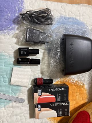 Lámpara de gel LED. Tres esmaltes de gel Sensationail para manicura permanente de color rojo, blanco y coral. Incluye gel base & top coat y gel primer, lima y toallitas limpiadoras. también incluye instrucciones.