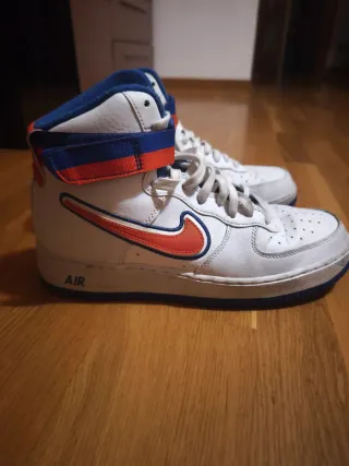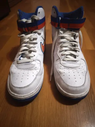 Zapatillas de caña alta Nike Air Force 1. - Diseño clásico en blanco con detalles en naranja y azul. - Cierre de cordones. - Correa ajustable en el tobillo con detalles de rayas.