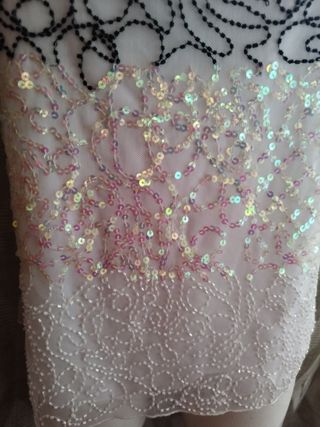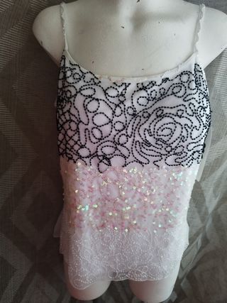 Tejido exterior de tul, con strass y lentejuelas. Forro interior. Es una talla 42, válida también para una 44. Las medidas son: - Axila a axila: 48 cm, estira hasta 54. - Cintura: 42 cm, estira hasta 46. - Largo: 54 cm.