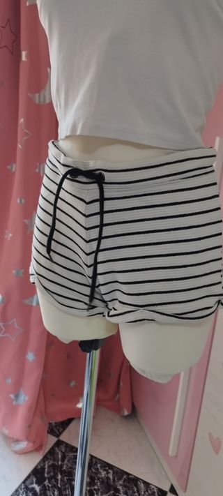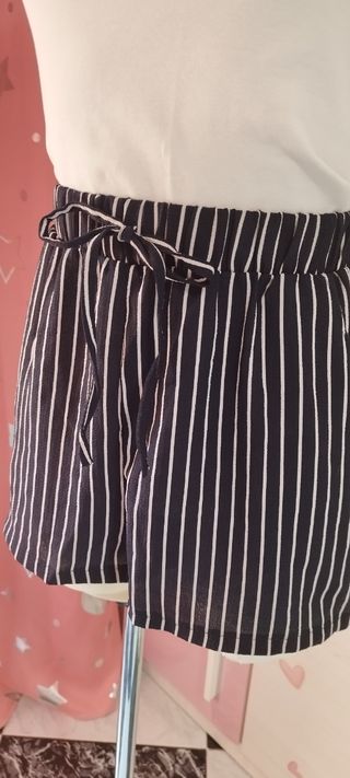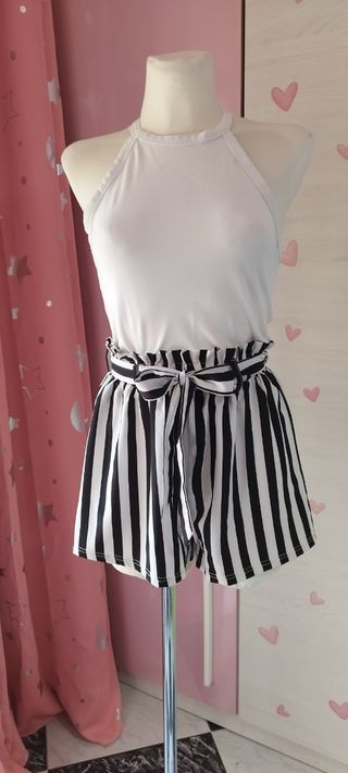 No incluye top!!! Los shorts son de tela ligera y tienen un diseño a rayas blancas y negras. Son ideales para el verano. Tela gruesa, con cordón para ajustar. Talla 38, hay medidas en las fotos. Tienen un pequeño agujero en la parte de dentro de la cintura, puesto no se ve