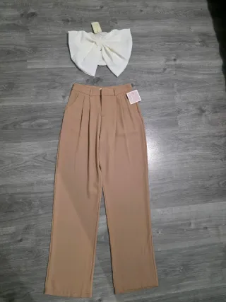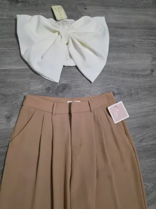 Conjunto de dos piezas con un diseño elegante. - Top blanco con lazo talla única - Pantalón largo de corte recto en color beige talla M. Nuevo con etiqueta 🏷
