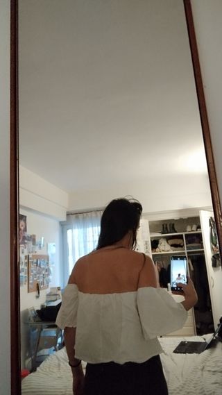 Perfecto estado. Como nuevo. Color blanco. Como para una talla 36 o 38 pequeña. Mucha caída. Largo, hasta la cadera. Para llevar por fuera. Tela tupida tipo crêpe. Sin defectos.