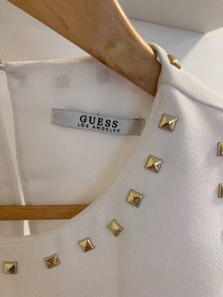 Precioso top blanco con un diseño elegante y detalles brillantes. - Tejido ligero y con textura. - Adornos metálicos dorados. - Tirantes al cuello. Talla única S/M ya que la espalda va con goma y es bastante flexible incluso para una talla L si no tiene mucho pecho tambien sirve. Muy fresquito y bonito para llevar en verano