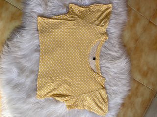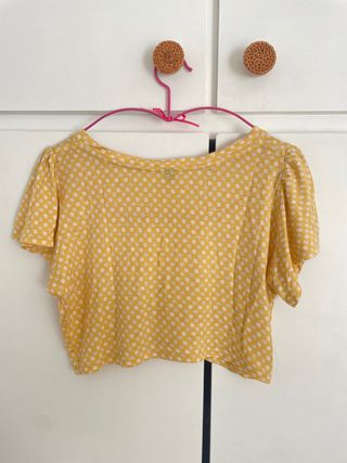 camiseta crop top amarilla limon con cuadraditos blancos, las mangas se quedan sueltas muy fresquita