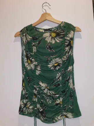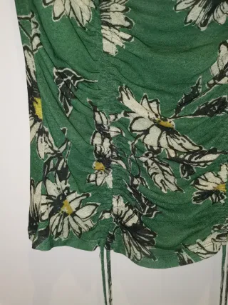 Top de tirantes con estampado floral y detalle fruncido. - Diseño con flores blancas y hojas verdes. - Tejido ligero y elástico. - Fruncido lateral con cordones ajustables.