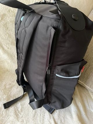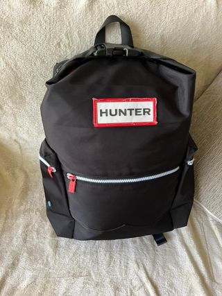 Mochila negra de la marca Hunter con cierre superior. - Cierre de clip. - Bolsillo frontal con cremallera.