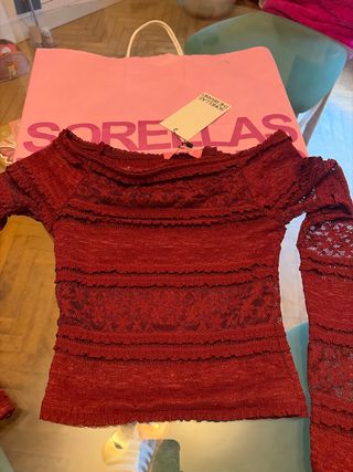 Precioso top de la marca Sorellas en color vino. Es una prenda elegante y moderna. - Diseño con escote Bardot. - Mangas largas acampanadas. - Detalle de volantes y encaje. - Tejido ligero y con textura.