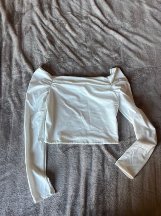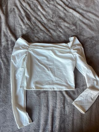 - Top blanco de manga larga - Escote Bardot. - Diseño fruncido en el escote. - Mangas abullonadas. - Corte cropped. - Nuevo, sin uso.