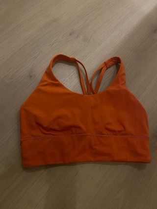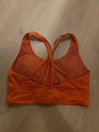 Top deportivo de la marca Ohyso en color naranja. - Diseño con tirantes cruzados en la espalda. - Banda elástica ancha en la parte inferior para mayor sujeción. -Con copas finas -Muy comodo