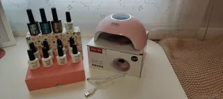Lámpara UV/LED para uñas de la marca Star, modelo 6S. - Color rosa. - Potencia de 54W. - Diseño 2-en-1. De regalo base coat, top coat mate, top coat normal y 9 colores nude otoñales. Abiertos solo para ver los colores y comprobar que están bien.