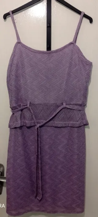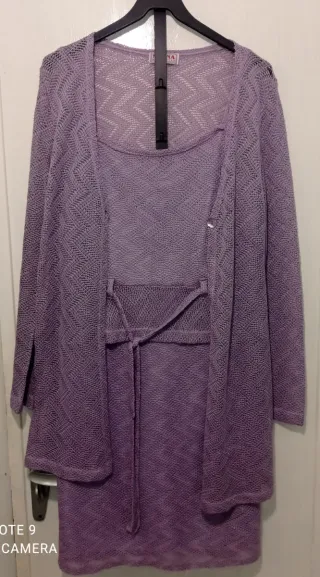Conjunto de tres piezas de punto fino con un diseño calado muy elegante. El abrigo es largo y abierto, el top es de tirantes y la falda es recta. - Tejido ligero y transpirable. - Detalle de cinturón para ajustar la cintura del top. - Acabado en color lila degradado.