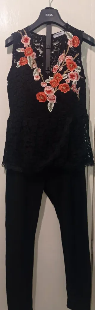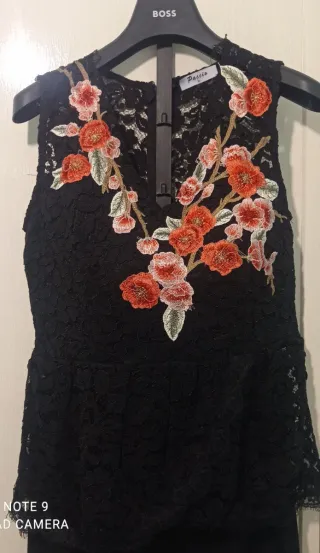 Elegante top de encaje negro con un precioso bordado floral en tonos rojos y rosas. El diseño sin mangas y con escote en V lo hace ideal para diversas ocasiones. - Encaje detallado. - Bordado floral llamativo. - Corte peplum. Medida de sisa a sisa 47cm