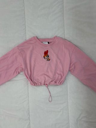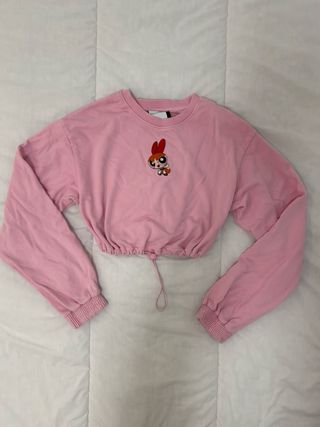 Top corto de color rosa con un divertido estampado de las Powerpuff Girls en el pecho. Tiene un cordón ajustable en el bajo para personalizar el ajuste. - En buen estado, marca Bershka, talla XS - Diseño cropped. - Estampado de personaje. - Cordón de ajuste en cintura.