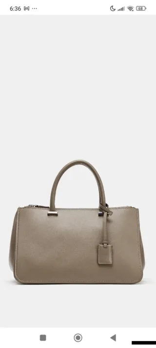 Bolso de mano de la marca Zara en color gris topo. Diseño elegante y moderno. - Asa superior. - Cierre de cremallera. - Detalle de etiqueta colgante.