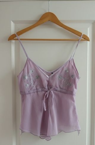 Elegante top lencero de gasa con detalles bordados y lentejuelas. - Diseño con tirantes finos. - Escote en V. - En la parte frontal inferior, bajo el lazo, cuenta con un detalle lineal de bordado en forma de espiga. - Cierre Invisible, con una cremallera oculta en el costado izquierdo, facilitando el ajuste al cuerpo. - Lazada bajo el pecho. - Bordados florales. Como se ve en las imágenes, queda ideal combinado con unos vaqueros blancos de tiro alto para un look de día fresco, o con una falda satinada para un evento nocturno. (marca la talla 40 pero da poca talla)