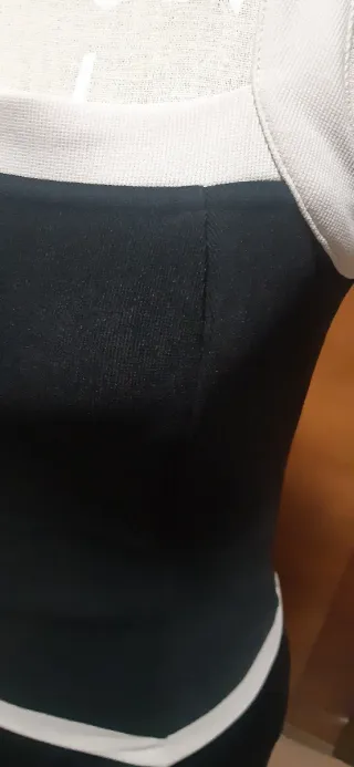 Conjunto de falda y top de tirantes, ambos de punto. Son negros con bordes en contraste color crudo. La falda cierra con cremallera