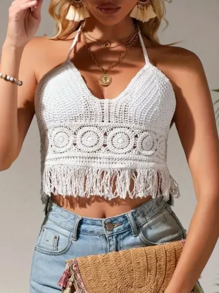 Este top de hilo es una prenda versátil y con un diseño único. - Tejido de hilo con detalles calados. - Adornado con flecos en el bajo. - Diseño tipo halter. - talla unica STANDAR