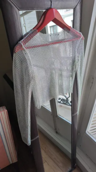 Top brillante de manga larga con un diseño de malla. - Tejido con acabado metálico. - Manga larga. - Cuello redondo. Medidas en cm: 43hombros 40axilas 42Largo 63 Largo manga