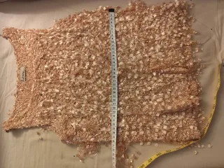 Festivo, de noche, peplum con vuelo. El diseño con volantes en el bajo le da un toque femenino y juguetón. Detalles: Totalmente cubierto de lentejuelas y adornos de textura a lo largo de toda la tela. Las lentejuelas son de un tono oscuro, con un brillo tornasolado, creando un efecto de brillo sutil y elegante. El tejido de base es de encaje o con una textura grabada.Ideal para: Fiestas, eventos especiales, salidas nocturnas o para añadir un toque de glamour a un conjunto casual con jeans o pantalones anchos.