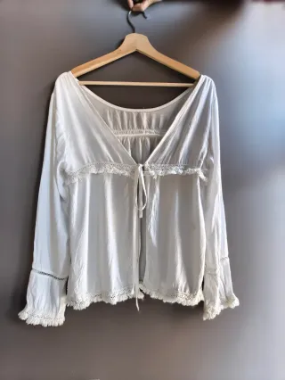 Camisa abierta de estilo boho chic con un diseño vaporoso y detalles de encaje de ganchillo y flecos. - Manga larga. - Cierre con lazada. - Adornos de encaje en puños y bajo. - Diseño abierto ideal para poner sobre un top..