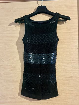 Top negro con detalle de lentejuelas en la parte superior. - Tirantes finos. - Parte inferior con cordón ajustable. - Diseño con lentejuelas plateadas. Me lo he puesto en dos ocasiones. el Corte Inglés talla 42. se ajusta en la parte de abajo.mas tops en mi perfil