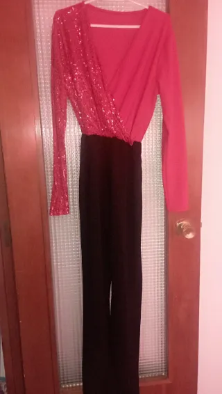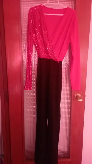 Mono elegante con top de lentejuelas rojas y pantalón negro. - Diseño cruzado en el torso. - Manga larga. - Pierna ancha.