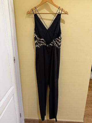 Elegante mono con un diseño llamativo en la parte superior y un pantalón de corte recto. - Top adornado con lentejuelas. - Tirantes finos. - Pantalón largo.