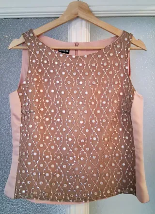 Elegante top sin mangas con un diseño de pedrería y detalles en forma de rombos. - Tejido principal con pedrería y lentejuelas. - Paneles laterales de satén. - Cierre de cremallera en la espalda. - Marca: MOPETE. Da poca talla, es más una 40/42. Pecho: 45 cm Alto: 50 cm