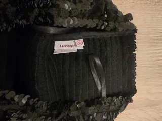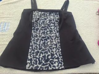 Top negro con un panel central de lentejuelas en blanco y negro. Con goma en la parte superior de la espalda; cierra con cremallera lateral. Medidas: Sisa 28 cm que llega a 50; Largo 42 cm