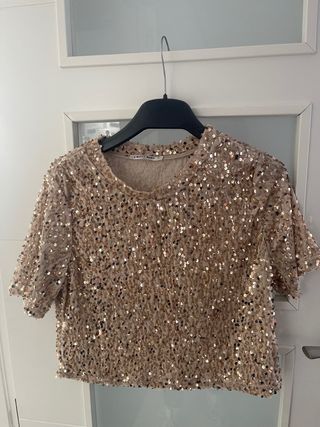 Top de Zara con un diseño llamativo y moderno. - Cuerpo principal cubierto de lentejuelas negras. - Mangas cortas con rayas plateadas y negras. - Corte cropped.