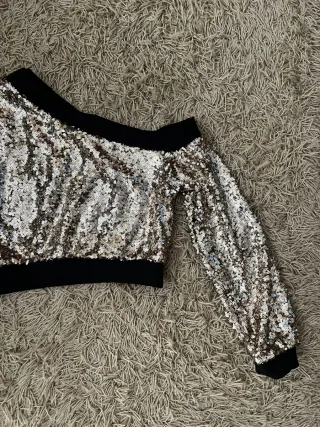 Top corto con lentejuelas brillantes, ideal para eventos y fiestas. Diseño de un solo hombro. Talla como una S. No tiene etiqueta porque es de tienda local. Ideal para pantalón de tiro alto. - Acabado con lentejuelas doradas y plateadas.