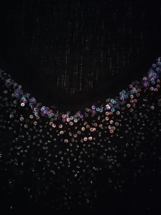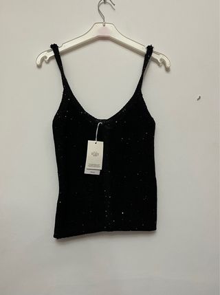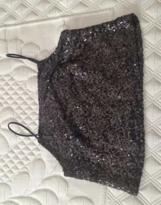 Elegante top negro cubierto de lentejuelas brillantes. Ideal para ocasiones especiales. - Diseño con tirantes finos. - Acabado totalmente cubierto de lentejuelas.