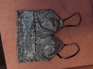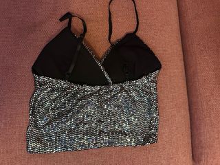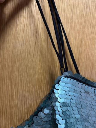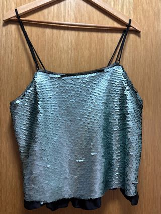 Top de fiesta con lentejuelas plateadas turquesas y detalles negros. - Diseño con tirantes finos regulables. - Acabado brillante. - Usado en dos ocasiones.