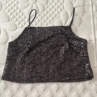 Top corto con lentejuelas brillantes y tirantes finos. Puesto 1 vez. Talla S de Lefties. - Diseño con lentejuelas. - Tirantes finos.