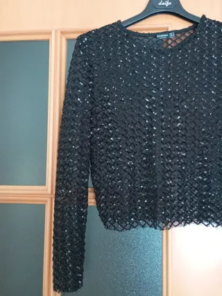 Elegante top de Stradivarius con un diseño llamativo. - Cuerpo principal cubierto de lentejuelas. - Mangas largas. - Detalle de tela lisa en la parte inferior. Le quité la etiqueta del cuello porque me rozaba