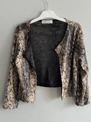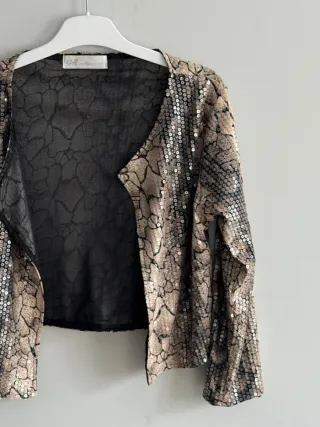 Elegante torera o blazer corto con un diseño floral intrincado y detalles de lentejuelas doradas. Perfecto para ocasiones especiales. - Tejido principal: negro con estampado floral. - Adornos: lentejuelas doradas. - Corte: crop top.