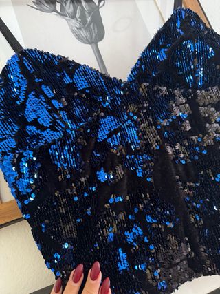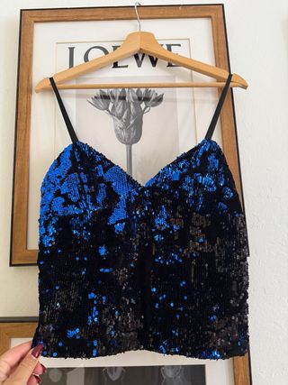 Top con lentejuelas brillantes. - Diseño con tirantes finos. - Acabado con lentejuelas azules y negras. Top Lentejuela súper elegante. Es XS pero vale para una S/M perfectamente. Tirante ajustable y precioso diseño. #zara #specialedition