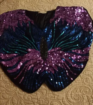 top de mariposa vintage. Está elaborado con una base de crochet adornada con lentejuelas plateadas y negras, y detalles de pedrería en el cuerpo central de la mariposa. sistema de cierre mediante cordones ajustables en el cuello y la espalda. Puede tener algún defecto pero no se aprecia