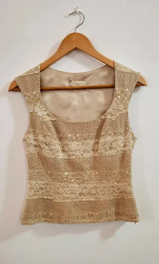 Top de fiesta beige marca Caroll, talla 36 Lentejuelas y botones de nácar.